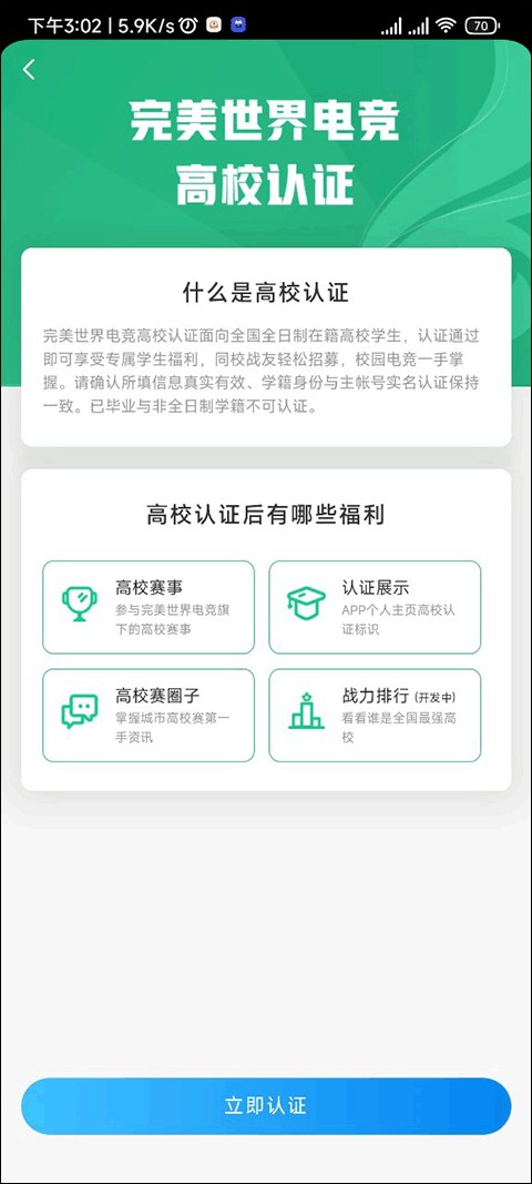 2、进入设置界面后点击高校认证,然后点击底部的立即认证。