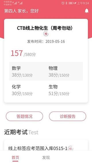 2、登录过后,在首页就能看到您孩子近期的考试列表,总分和各科成绩一目了然。