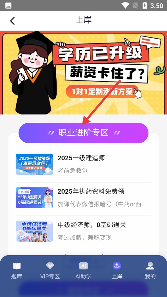 2、应用上岸页面的职业进阶专区展示2025一级建造师等考前资料,还有执业药师、中级经济师备考内容。