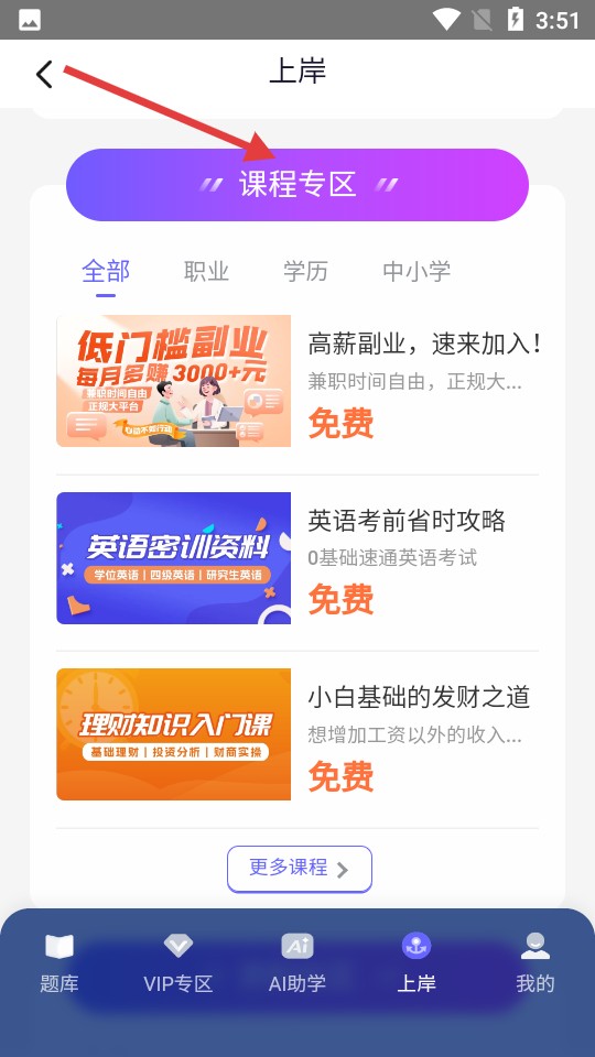 3、上岸的课程专区含职业、学历等类别课程,有低门槛副业、英语密训、理财入门等免费课程,可点击查看更多。