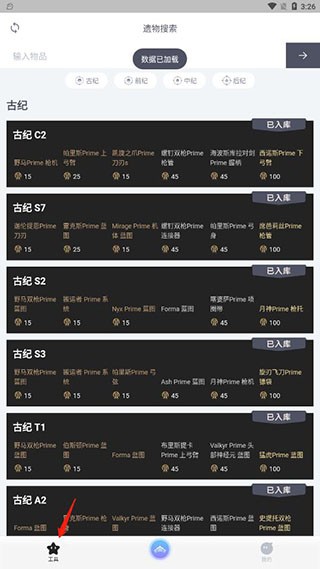 2. 装备管理:创建战甲属性比较模块,支持MOD组合效果模拟和遗物掉落概率计算。