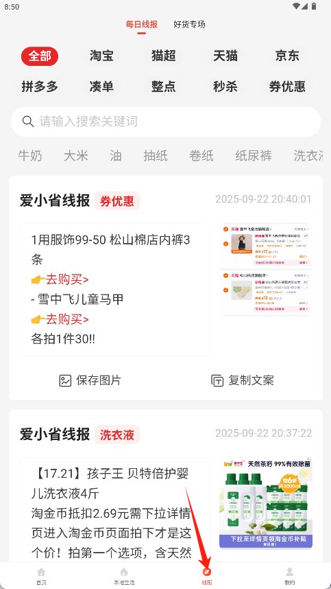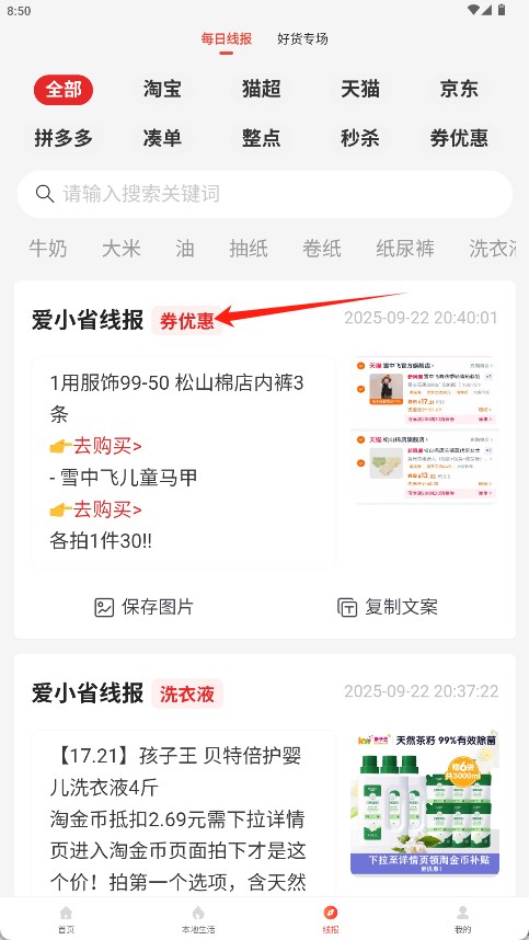 2、在首页点击线报直接搜索目标优惠。