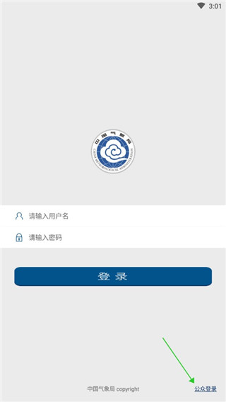 1、安装中国气象局app,进入软件,点击右下角公众登录按钮