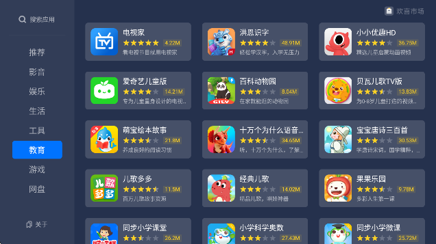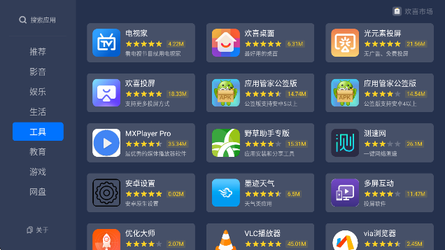 海量应用:喜欢市场app收录了大量优质电视应用,涵盖各类影视、游戏、工具等,满足您不同的需求。